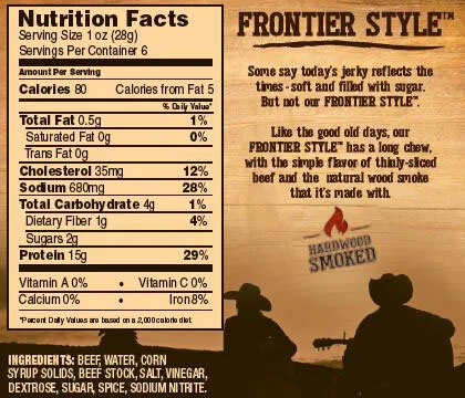 Some say today’s jerky reflects the times – soft and filled with sugar. But not our FRONTIER STYLE. Like the good old days, our Frontier Style has a long chew, with the simple flavor of thinly-sliced beef and the natural wood smoke that it’s made with.