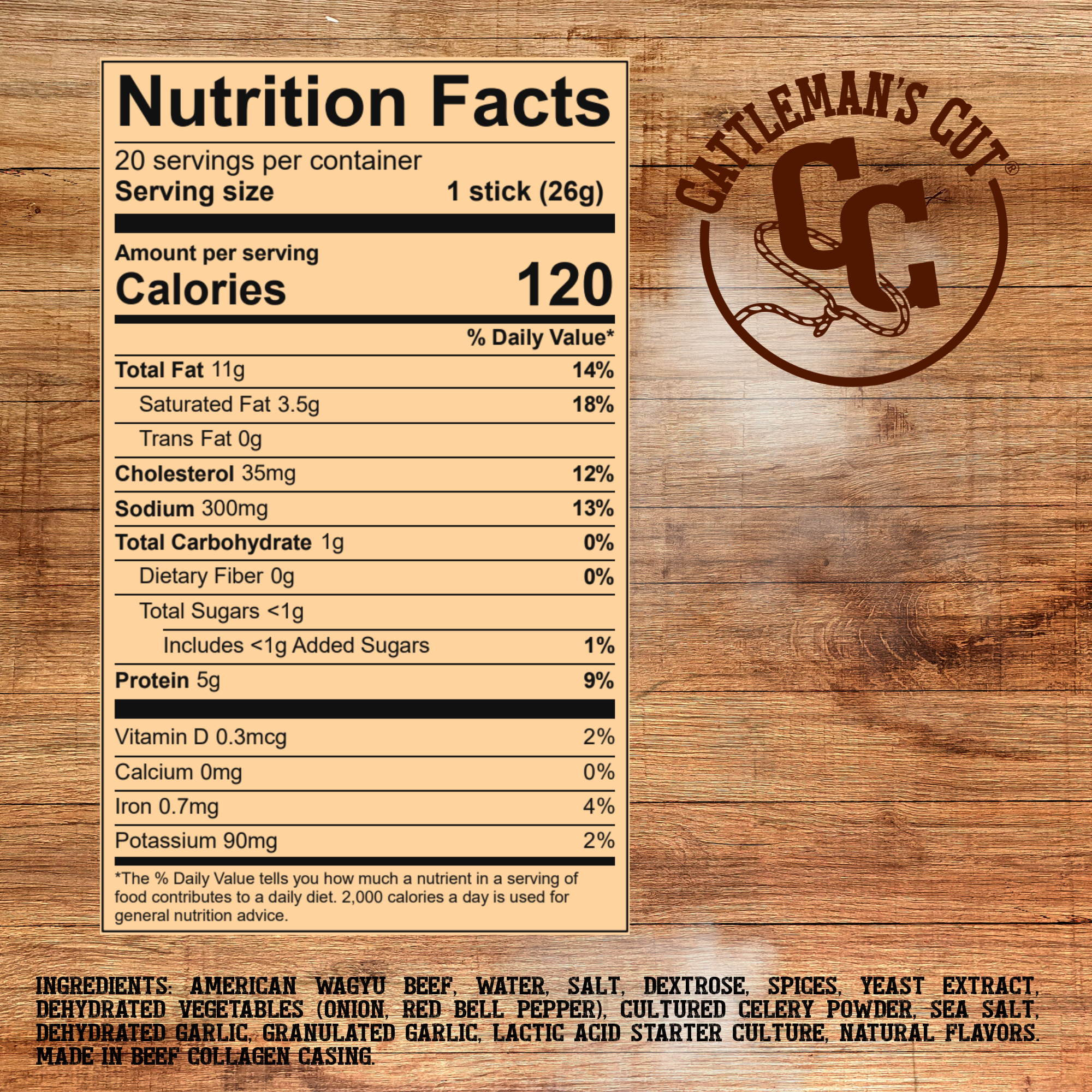 AMERICAN WAGYU BEEF, WATER, SALT, DEXTROSE, SPICES, YEAST EXTRACT, DEHYDRATED VEGETABLES (ONION, RED BELL PEPPER), CULTURED CELERY POWDER, SEA SALT, DEHYDRATED GARLIC, GRANULATED GARLIC, LACTIC ACID STARTER CULTURE, NATURAL FLAVORS. MADE IN BEEF COLLAGEN CASING.